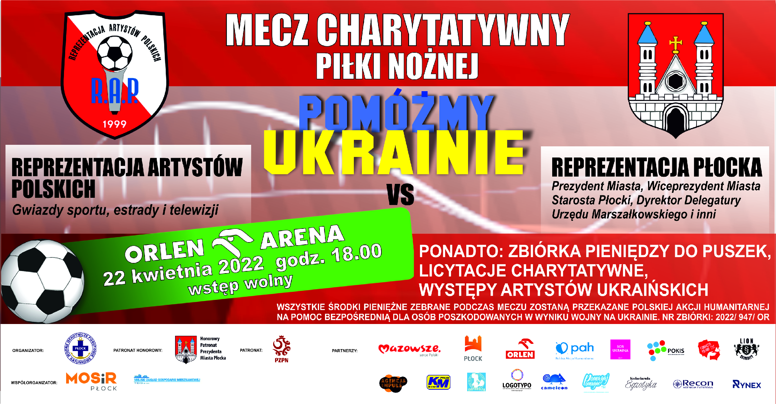 W dniu 22 kwietnia 2022 r. płocki WOPR, wspólnie z MOSiR Płock Sp. z o. o. oraz MZGM TBS Sp. z o.o., organizuje mecz piłki nożnej, z którego dochód w całości zostanie przekazany dla walczącej Ukrainy. W meczu weźmie udział Reprezentacja Artystów Polskich, składająca się z najbardziej znanych i medialnych polskich aktorów, muzyków, sportowców i gwiazd show-biznesu oraz Reprezentacja Płocka w składzie której zobaczymy: Prezydenta Miasta Płocka, Wiceprezydenta Miasta Płocka, Dyrektora Delegatury Urzędu Marszałkowskiego w Płocku, Starostę Płockiego, płockich Radnych, znane gwiazdy sportu, estrady i telewizji z Mazowsza.