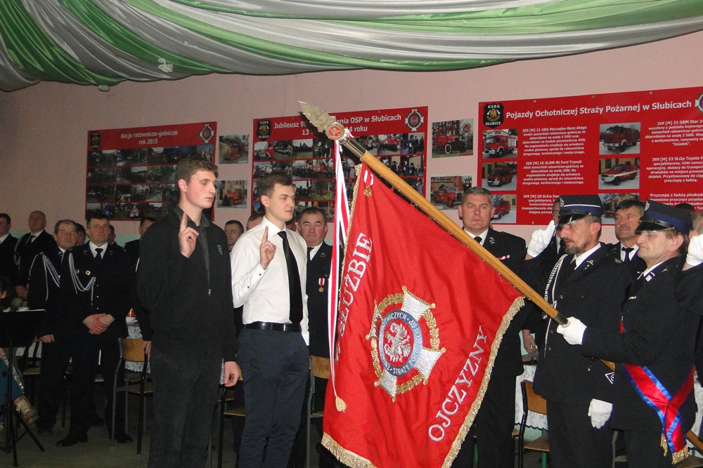 Po wyborze komisji nastąpił miły akcent ślubowania na sztandar nowo przyjętych członków OSP Słubice. Uchwałą Zarządu OSP z dnia 27 grudnia 2017 r. w poczet członków OSP zostali przyjęci: Marcin Wasilewski, Adrian Piątkowski, Kamil Brzoza oraz Adam Gołaszewski. Po ślubowaniu zostały wręczone legitymacje. Wręczenia legitymacji dokonali: Prezes OSP Słubice, Wiceprezes Zarządu Oddziału Gminnego Związku OSP RP – Marek Tarka w asyście Prezesa Zarządu Oddziału Gminnego Związku OSP RP, wójta gminy – Krzysztofa Dylickiego oraz Naczelnika Wydziału operacyjnego Komendy Miejskiej PSP w Płocku – Artura Czachowskiego.